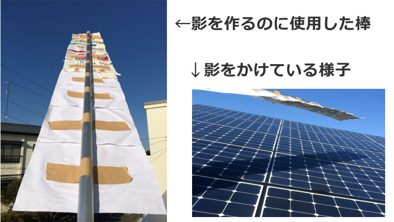 今回の実験では、影をかけることでどれくらいの発電量に低下するかをみてみました。