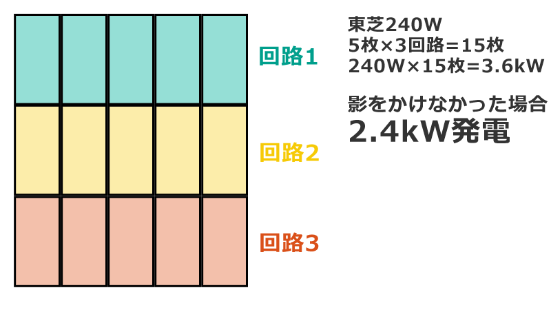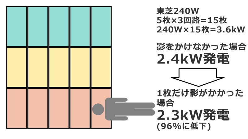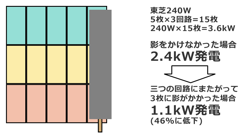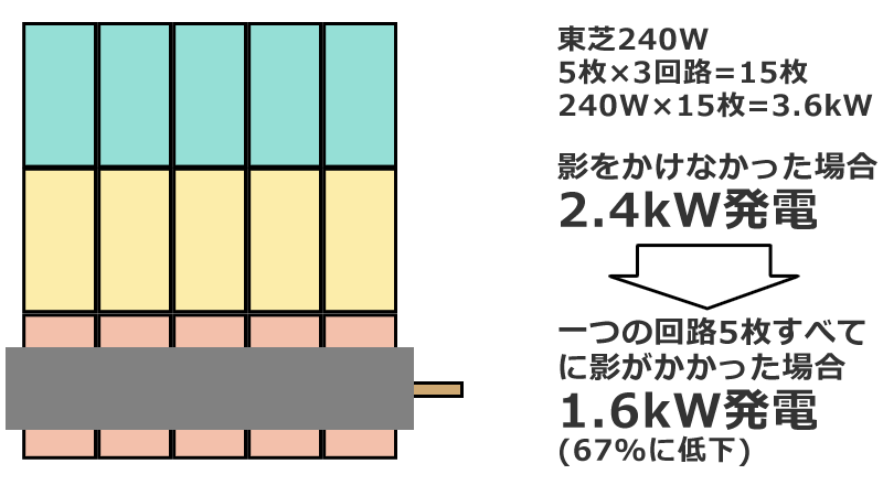 つまり、全部で3つの回路があるうち、1つの回路は5枚すべての太陽光パネルに影をかけて、残りの2つの回路には全く影がかかっていない状況になります。