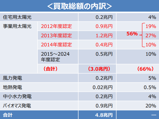 ご覧いただくとわかる通り、買取費用の6割以上が事業用太陽光(その容量が10kW以上のいわゆるメガソーラーなどの地面に大量に設置されている類のものです)、そしてそのほとのどがFIT開始当初の3年間に事業認定されたものに集中しています。