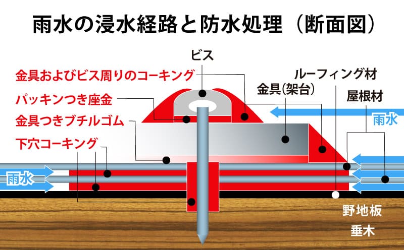 これらの侵入経路のすべてに防水処理を行うことで、雨水の侵入を防ぎます。