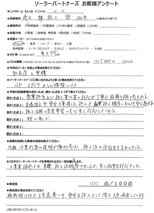 埼玉県狭山市柏原でパナソニックHIT245α、120αの太陽光発電3.915kWを設置したN.K様からの口コミ・評判